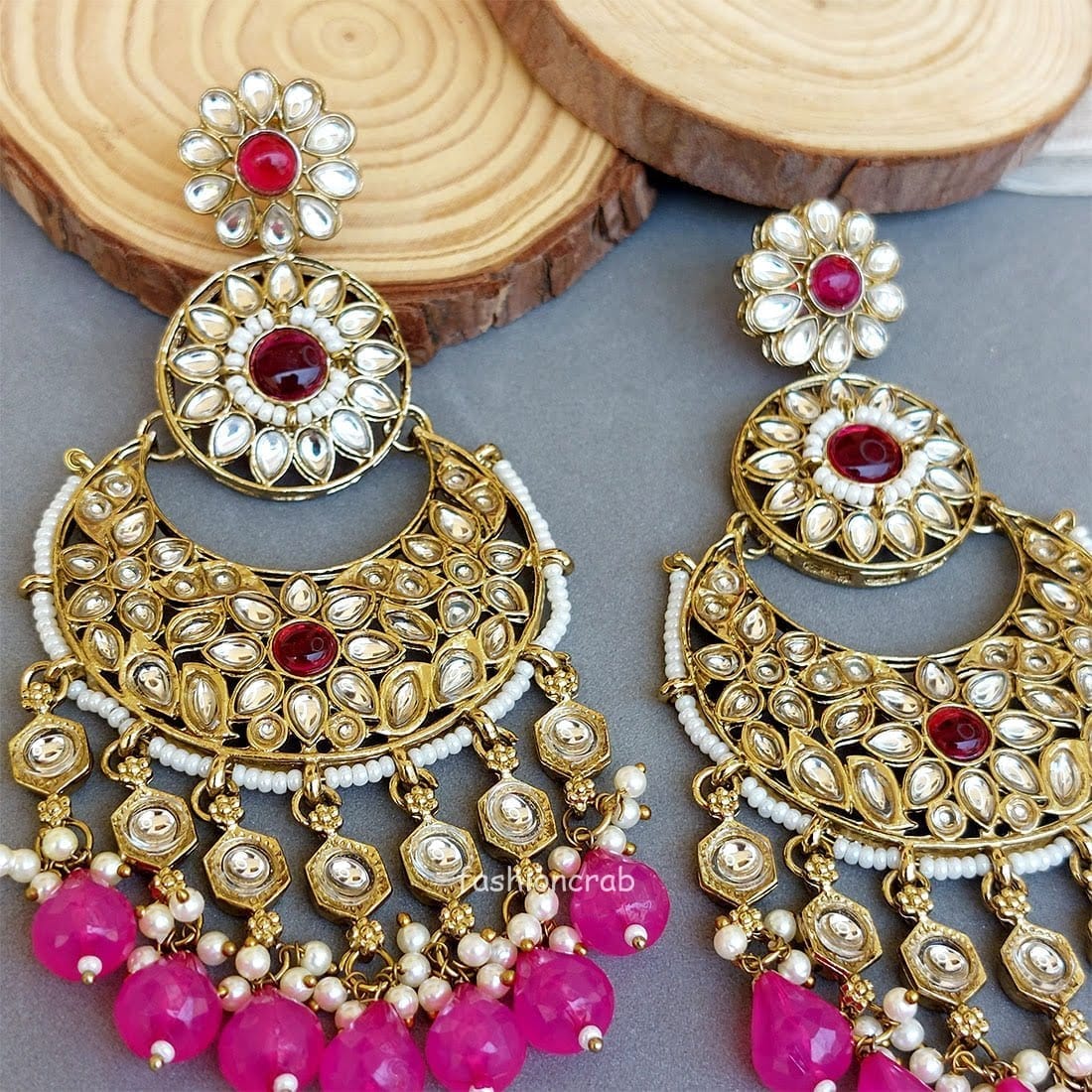 A pair of Golden-toned Priyanka Chandbali Earrings – Pink with pearl hanging.