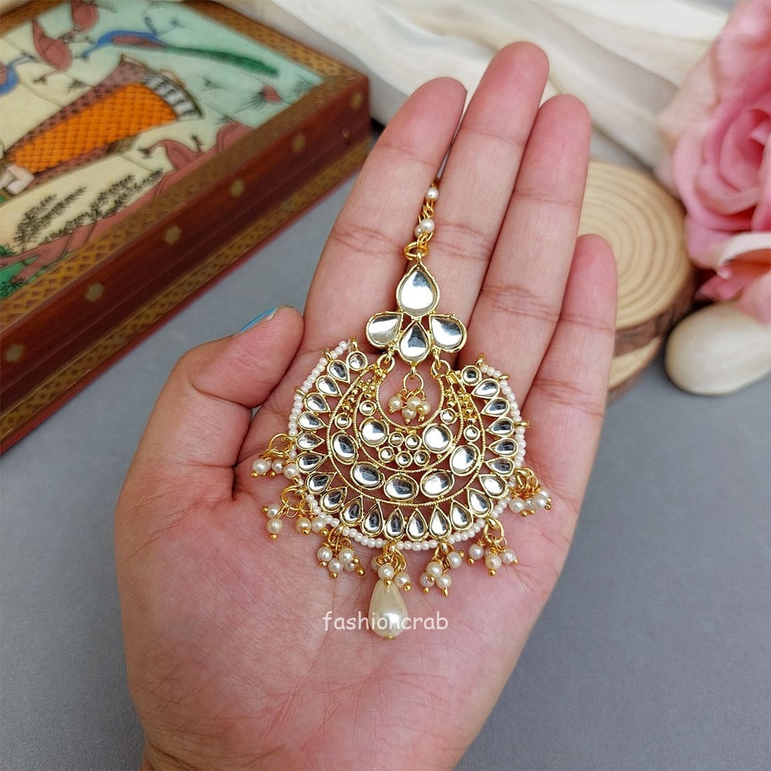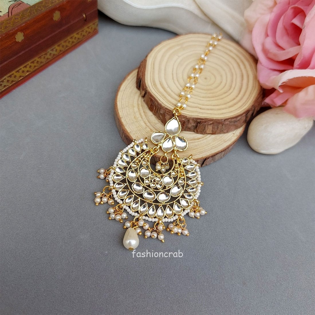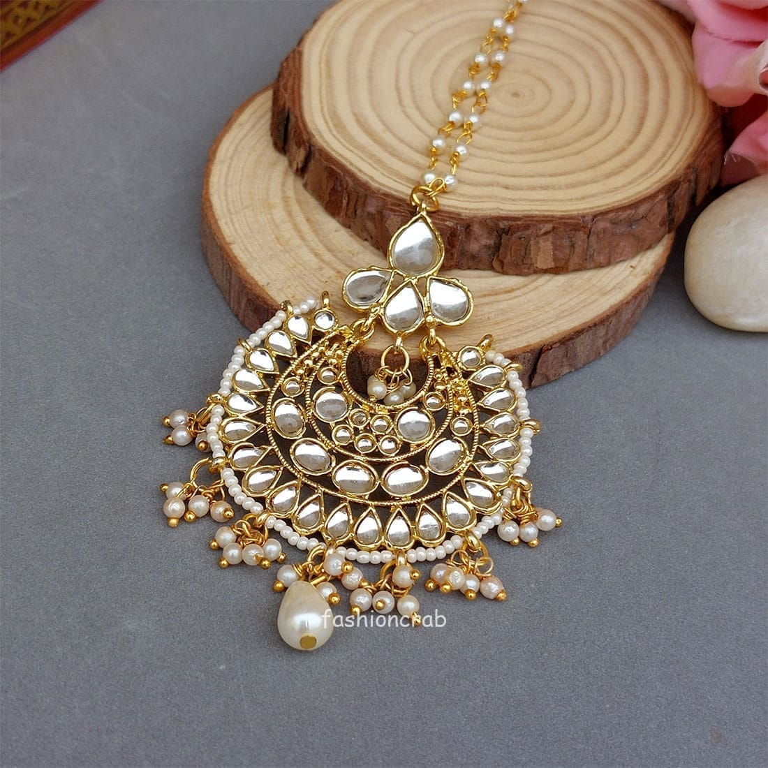 Look stunning in your evening wear with this Pearl MaangTikka for Girls from Fashioncrab. Made from brass, these Maang Tikka give you a traditional look. Kundan Pearl Maang Tikka is very much in high trend give you a real ethnic as well as royal look. This Ethnic Two Layer Kundan Maang Tikka can go along with any traditional dress and will give an elegant touch to your attire and makes you stand out in the crowd. You can match this Designer Maang Tikka with any Indian wear and it can be worn for engagement and marriage parties. This handmade jewelry will give you traditional as well as Indian look. This Maang Tikka is best suited for any length of forehead.
