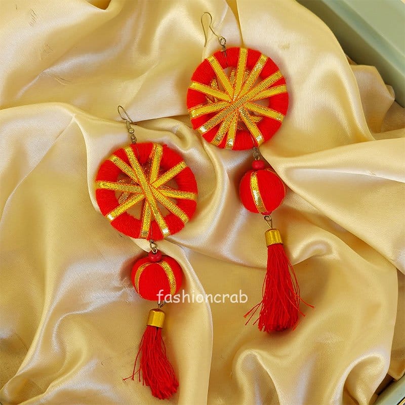Look stunning in your evening wear with these Red Gota Long Earrings from Fashioncrab. Made from gota and thread, these drops give you an eye-catching ethnic look. Red Gota Patti Long Drop Earring is very much in high trend give you a real ethnic as well as occasional look. These red color women gota earrings will give an elegant touch to your attire and makes you stand out in the crowd. You can match these gota earrings with any ethnic wear and it can be worn for engagement and wedding parties, mehndi, sangeet, etc. This handcrafted jewelry will give you traditional as well as royal look.