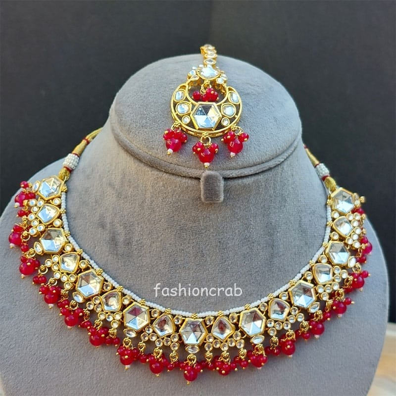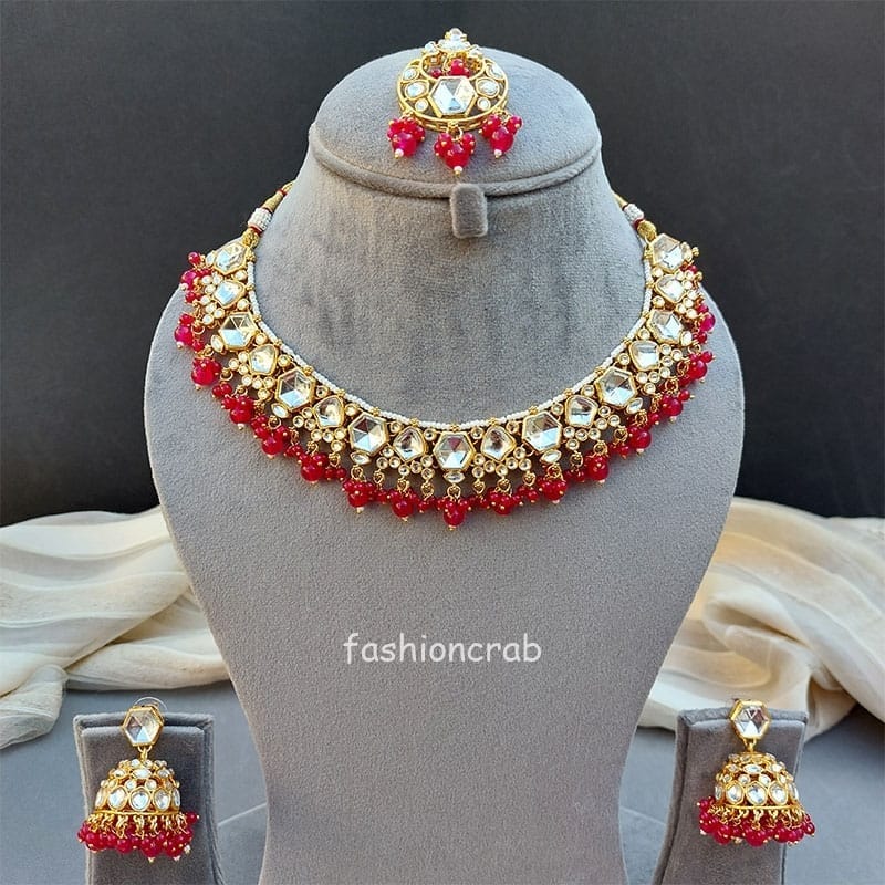 A pair of Traditional Rhea Kundan Jewellery Set – Dark Pink for a Saree.