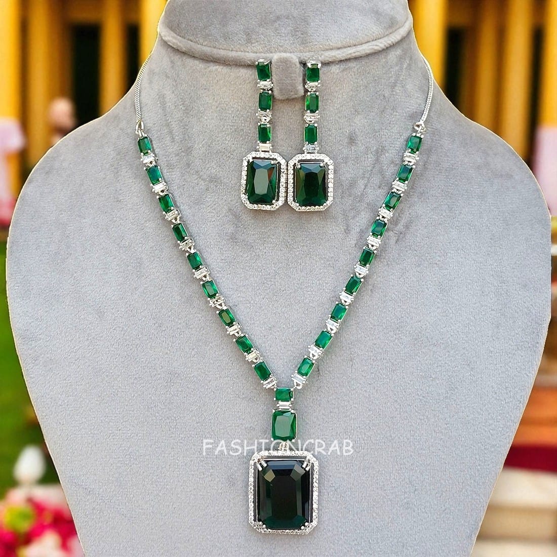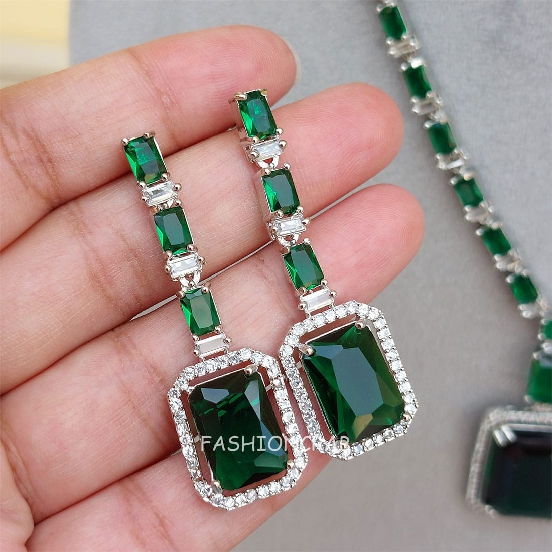 A pair of Silver Tone Rosy AD Jewellery Set – Green Set for a Wedding.
