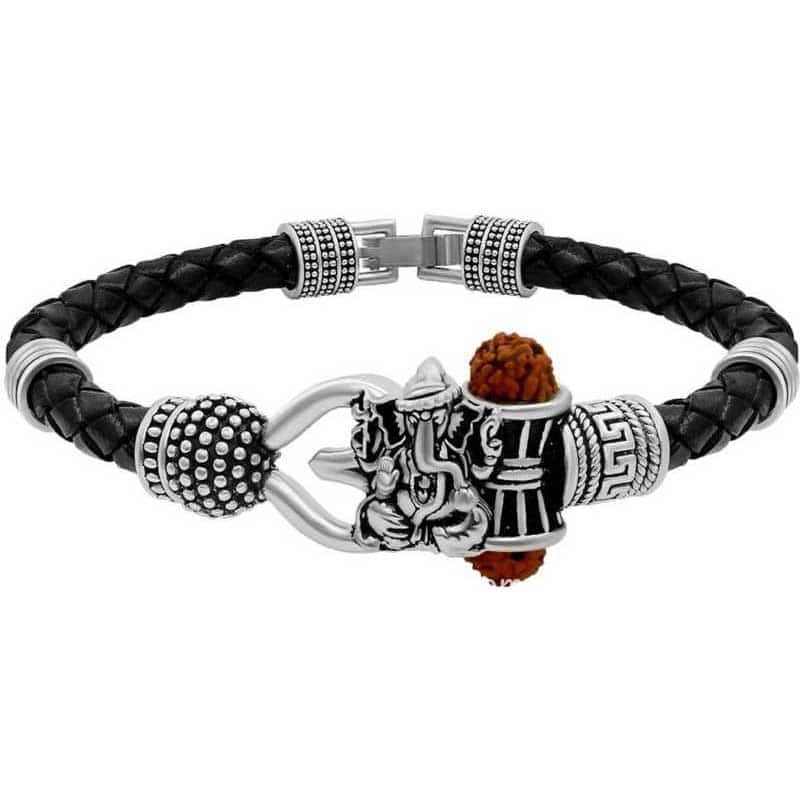 An antique Silver Tone Om Damru Brass Ganesh Rudraksha Bracelet for Men – with exquisite Lord Ganesh design with Rudraksha Om Damru. This Overlapping Black Bracelet can be easily slipped onto any wrist size. This Om Damru Black Bracelet can be accessorize with any ethnic or western apparels.