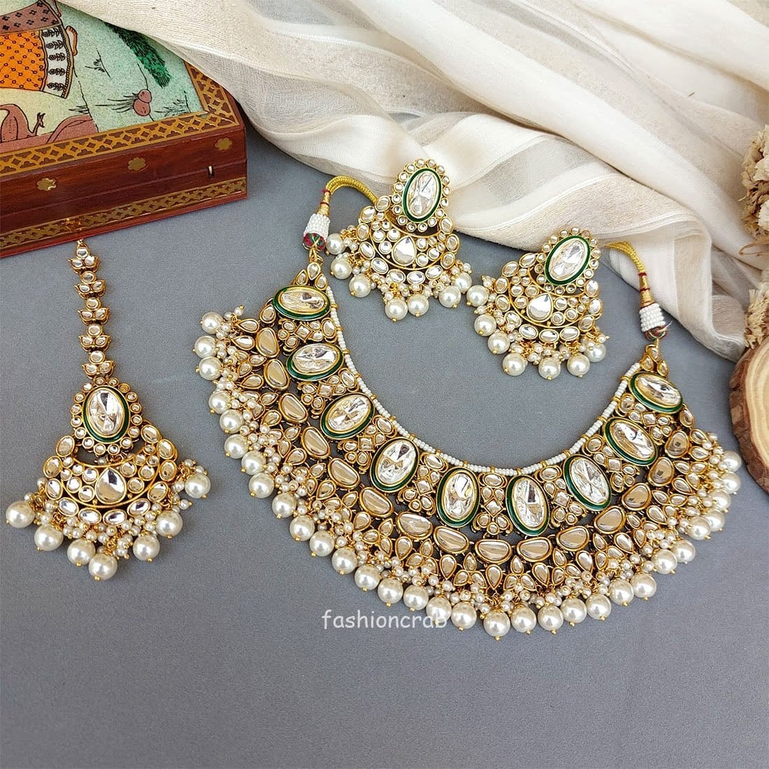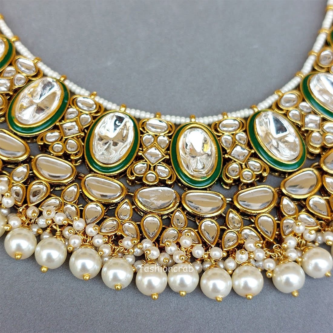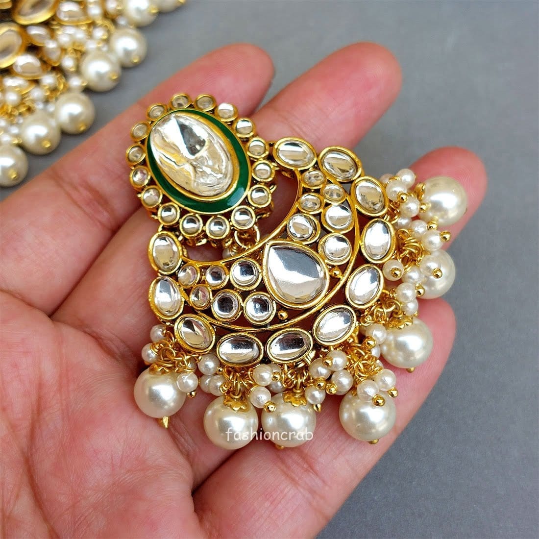 A pair of Traditional Sakshi White Kundan Necklace Set for a Saree.