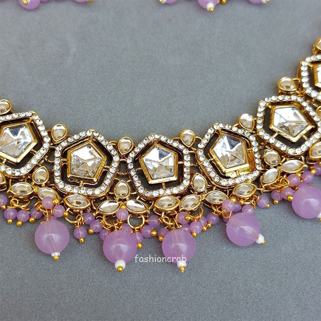 A pair of Sana Kundan Necklace Set – Lavender for Shaadi.