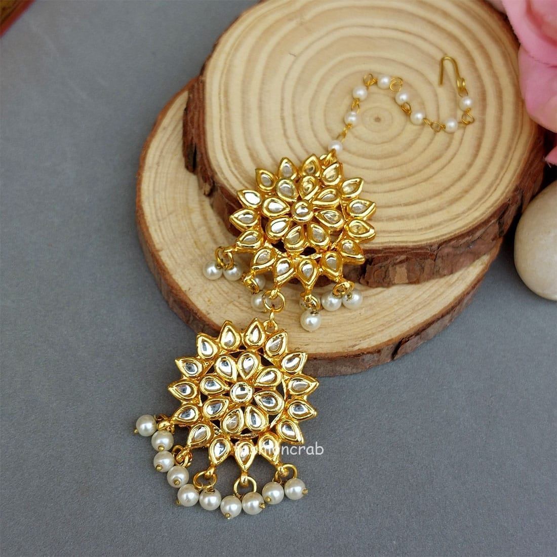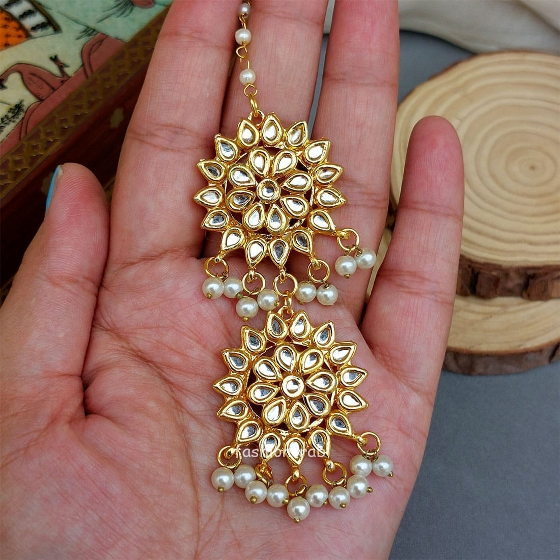 Look stunning in your evening wear with this Kundan Pearl MaangTikka for Girls from Fashioncrab. Made from brass, these Maang Tikka give you a traditional look. Kundan Pearl Maang Tikka is very much in high trend give you a real ethnic as well as royal look. This Ethnic Two Layer Kundan Maang Tikka can go along with any traditional dress and will give an elegant touch to your attire and makes you stand out in the crowd. You can match this Designer Maang Tikka with any Indian wear and it can be worn for engagement and marriage parties. This handmade jewelry will give you traditional as well as Indian look. This Maang Tikka is best suited for any length of forehead.