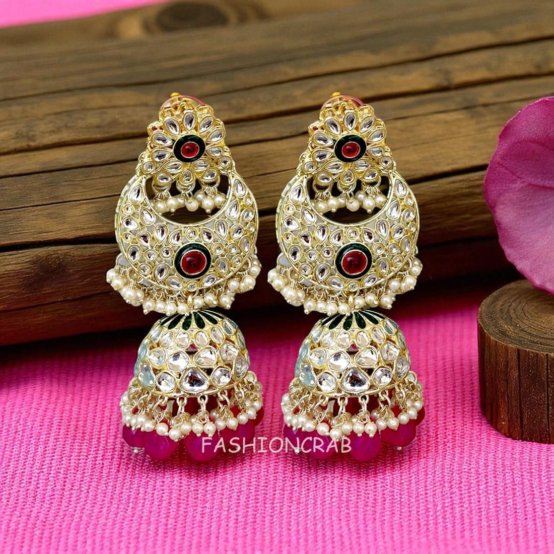 A pair of golden-toned Soundarya Kundan Jhumka Earrings – Pink Earrings for Girls with hanging pearls.