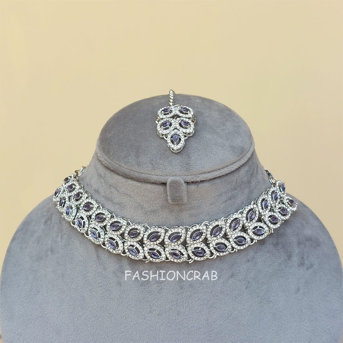 A pair of Silver Tone Zeenat AD Choker Set – Purple Necklace Set for a Wedding.